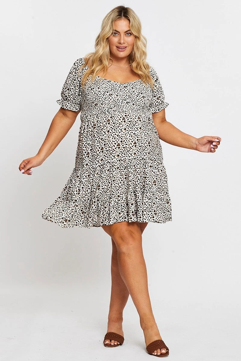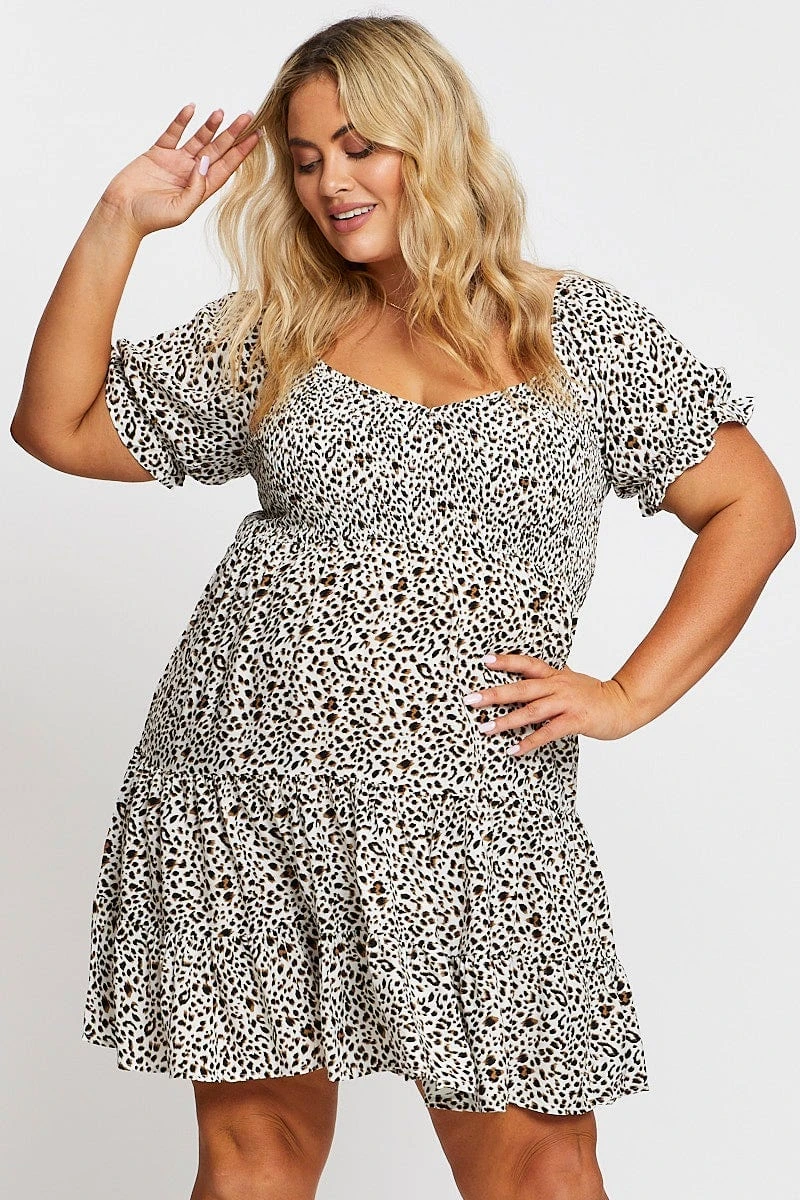 Feature: Puff Sleeves , Shirred Bodice, Animal Print, Sweetheart Neckline