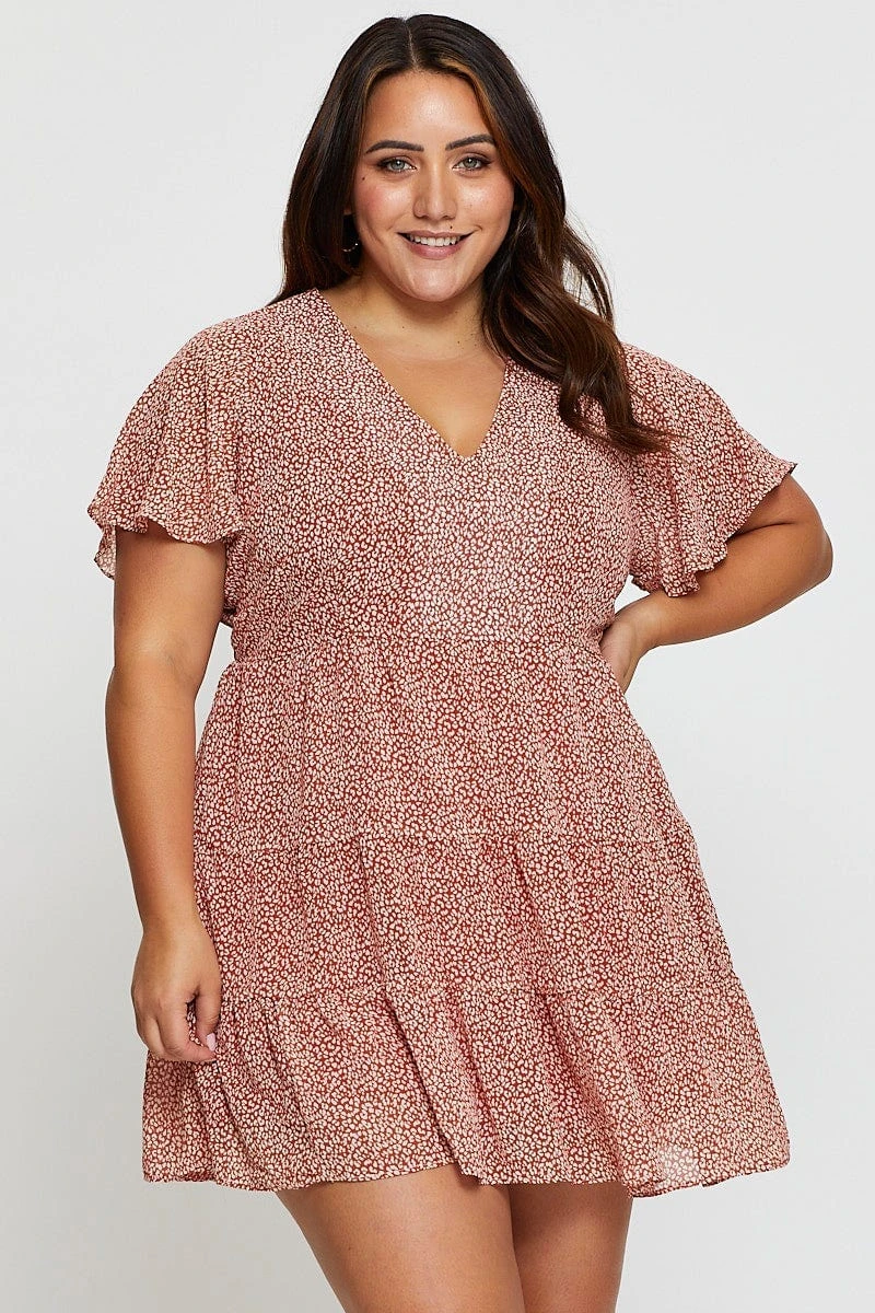 Feature: Animal Print, V Neckline, Tiered Design, Short Sleeves