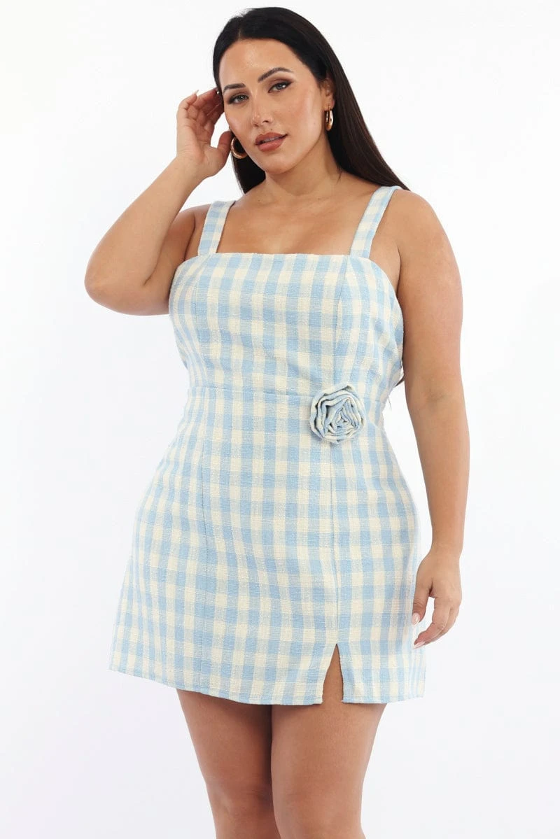 Be the first to review “Blue Check Mini Dress Sleeveless Rosette Detail” Cancel reply