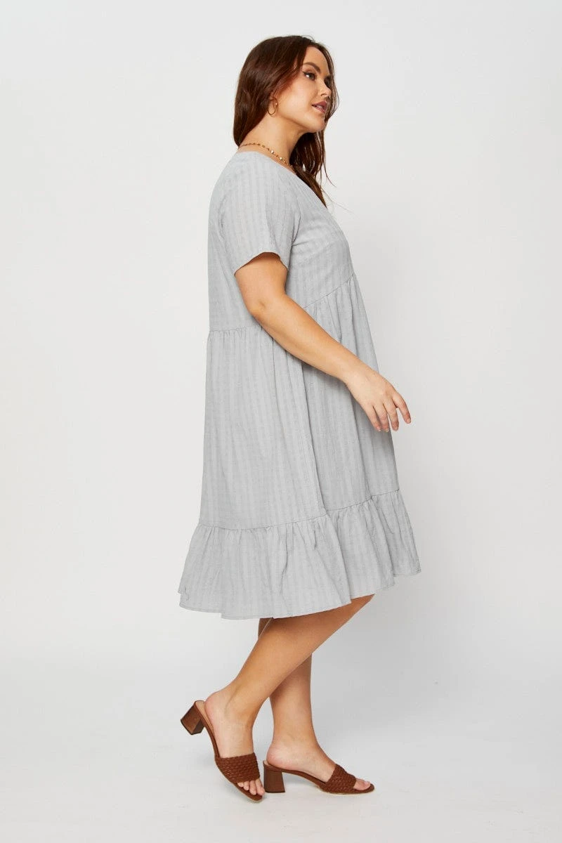 Feature: Striped Print, V neckline, Short Sleeves, Frill Hem