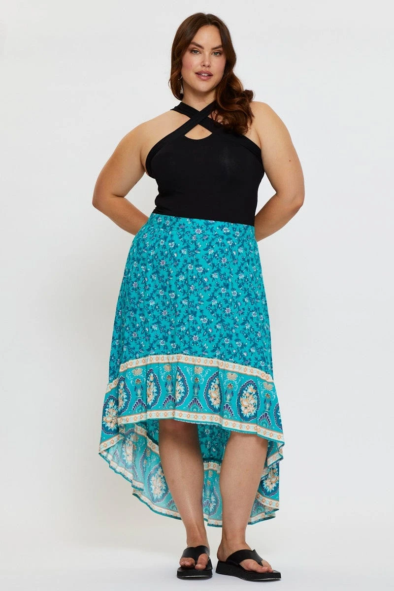 Feature: Boho Print, Asymmetric Hem, Elasticised Waistband, Midi Length