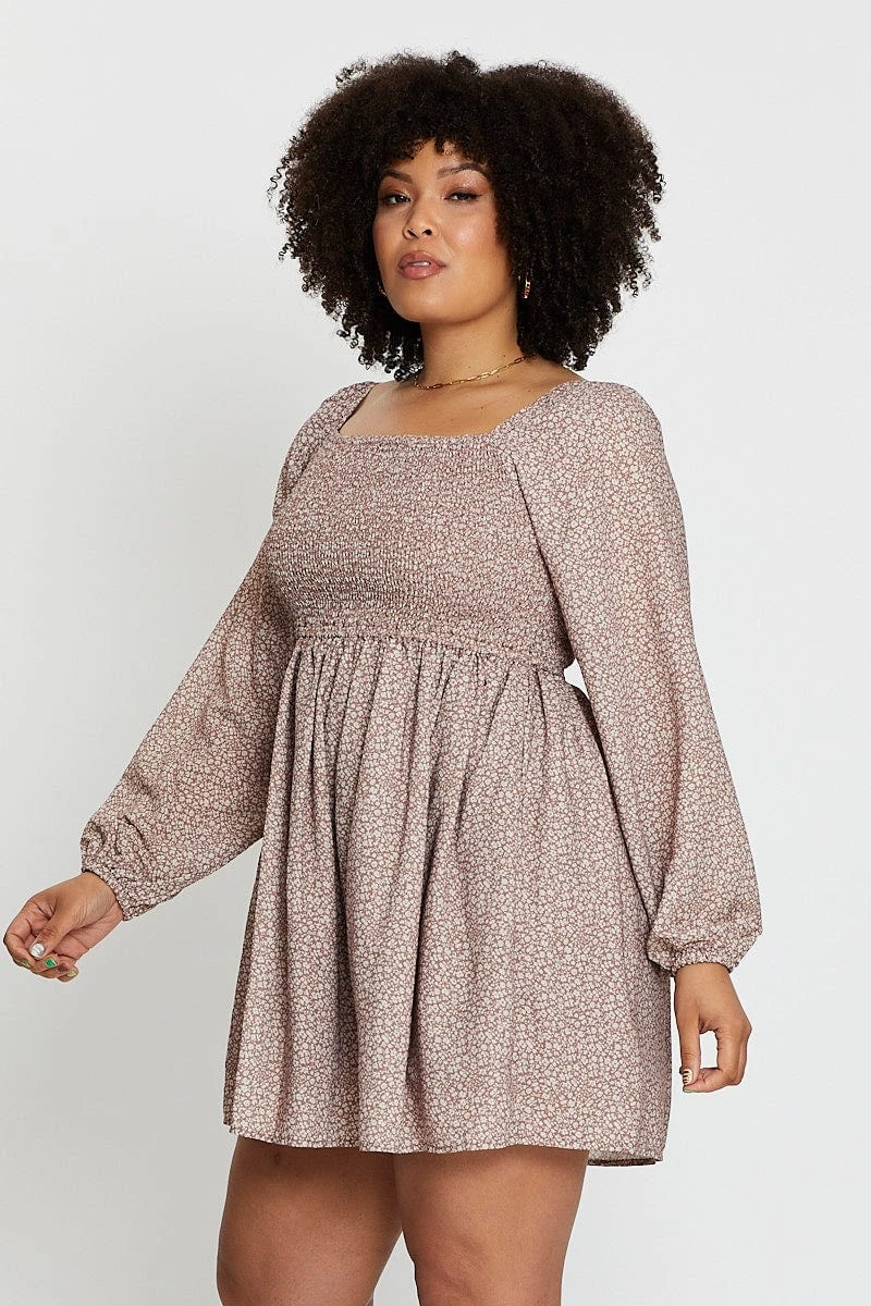 Feature: Shirred Bust, Ditsy Print, Long Sleeves, Mini Length