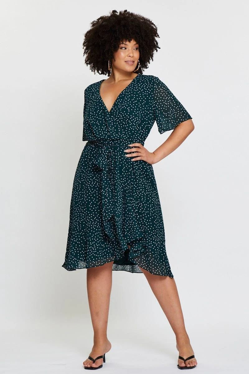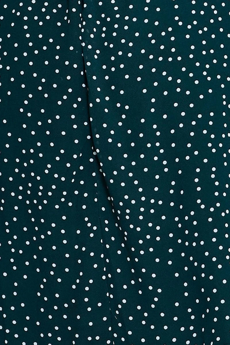Feature: Polka Dot Print, Back Zipper, Waist Tie, Ruffle Hem