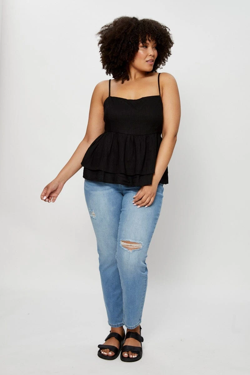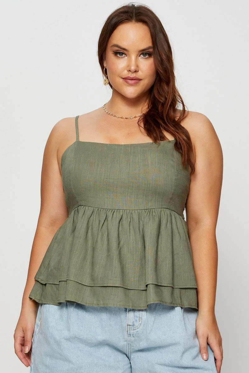 Feature: Peplum Shape, Linen Blend, Ruffle Hem, Shirred Back Detail