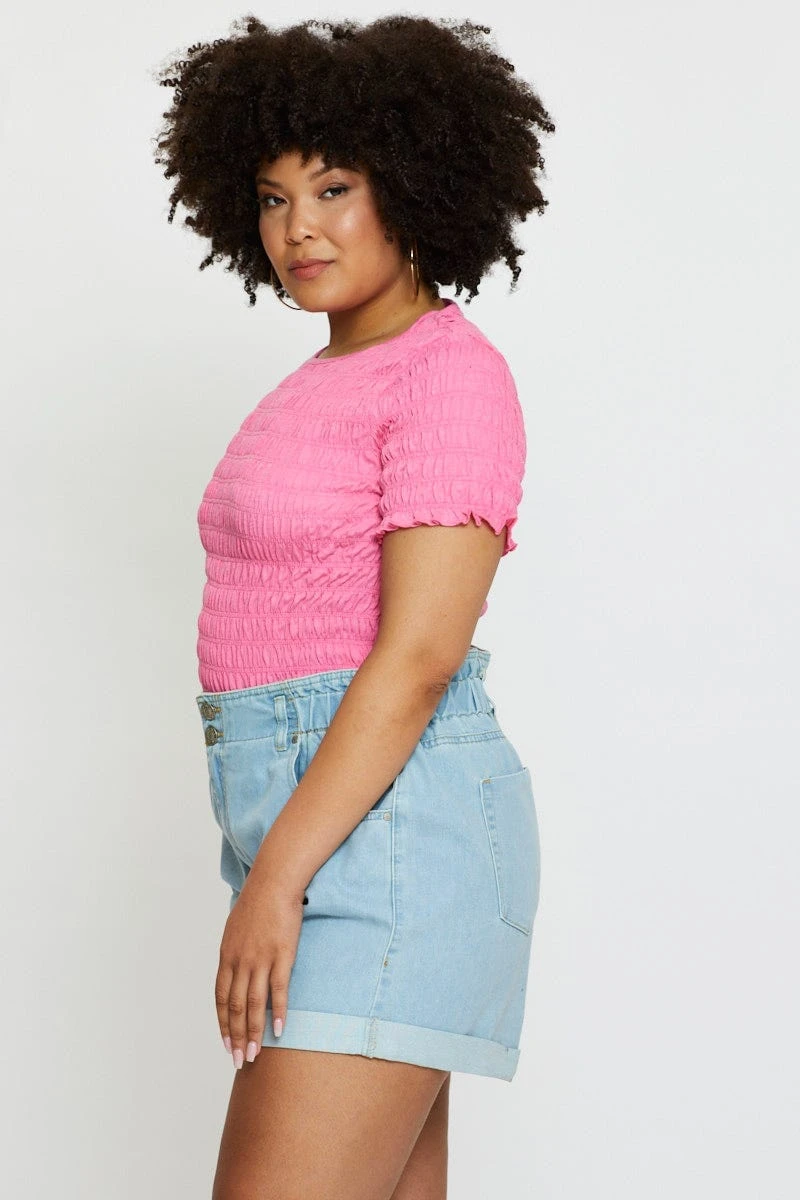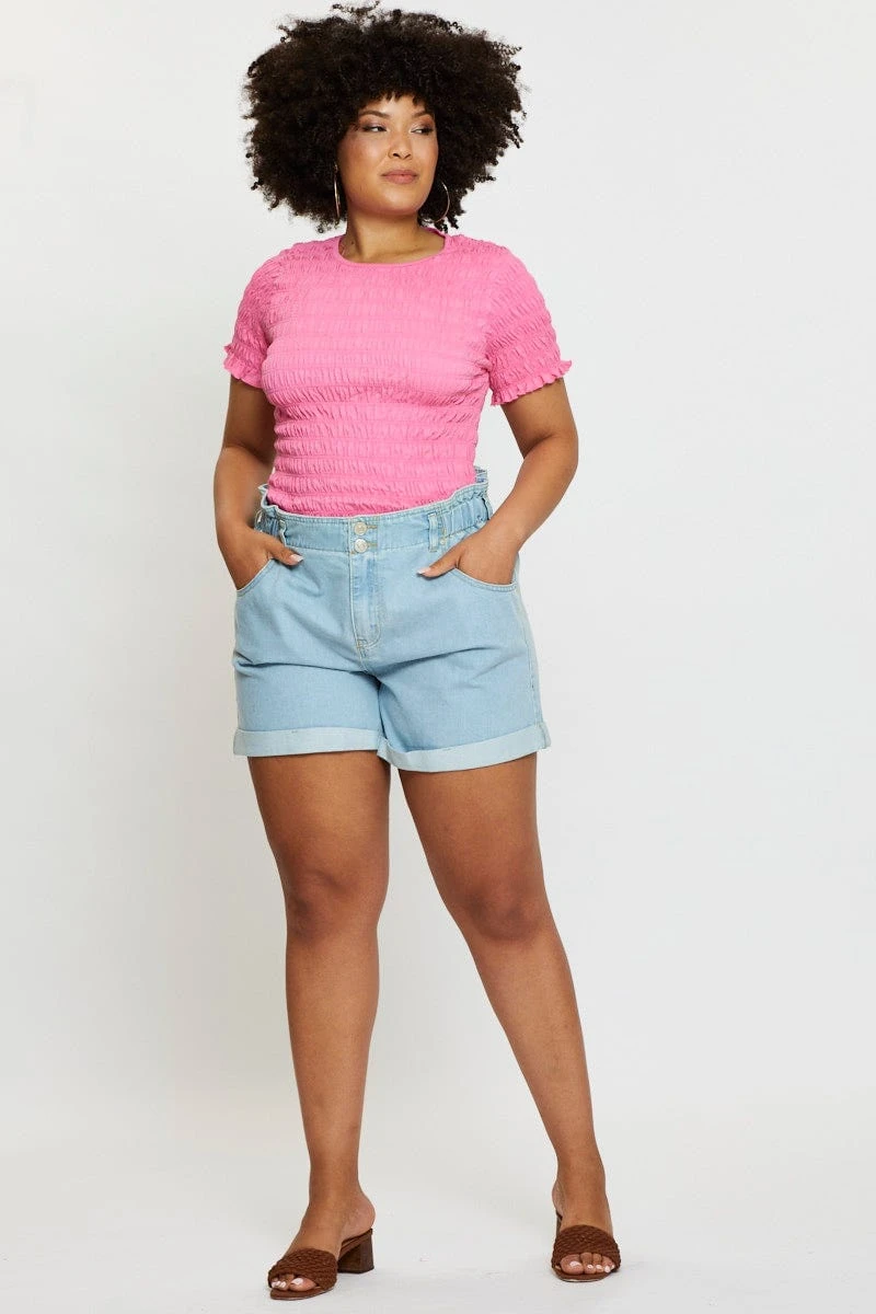 Feature: Rolled Hem, Double Button, Elasticised Waistband, Light Wash