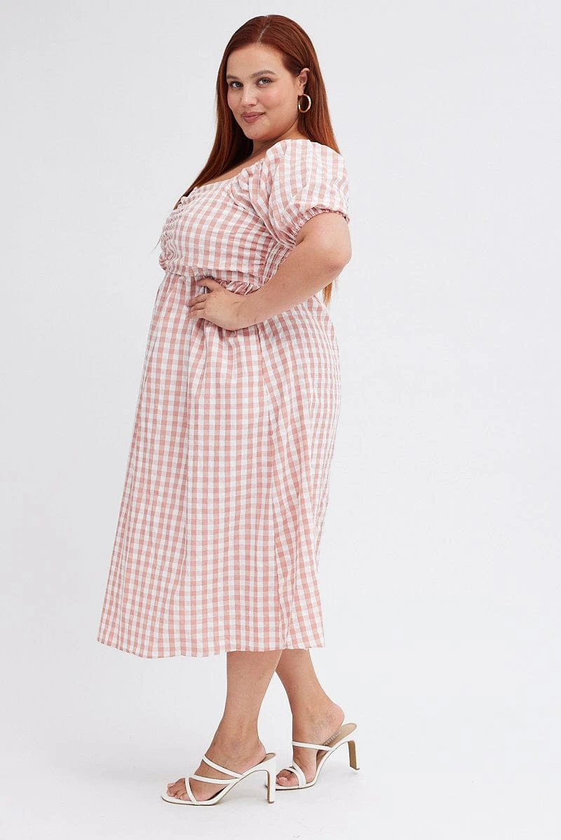 Be the first to review “Pink Check Midi Dress Ruched Bodice Gingham Puff Sleeve” Cancel reply