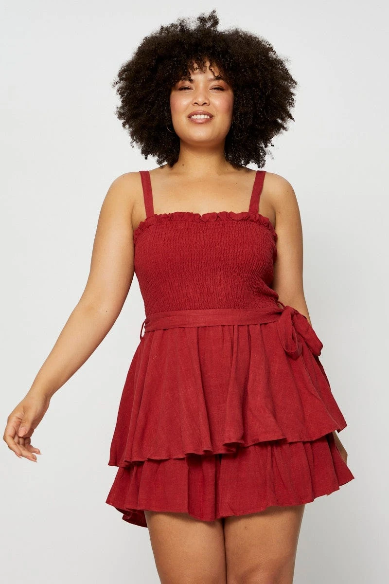 Feature: Shirred Bodice, Layered Detail, Adjustable Straps, Belt